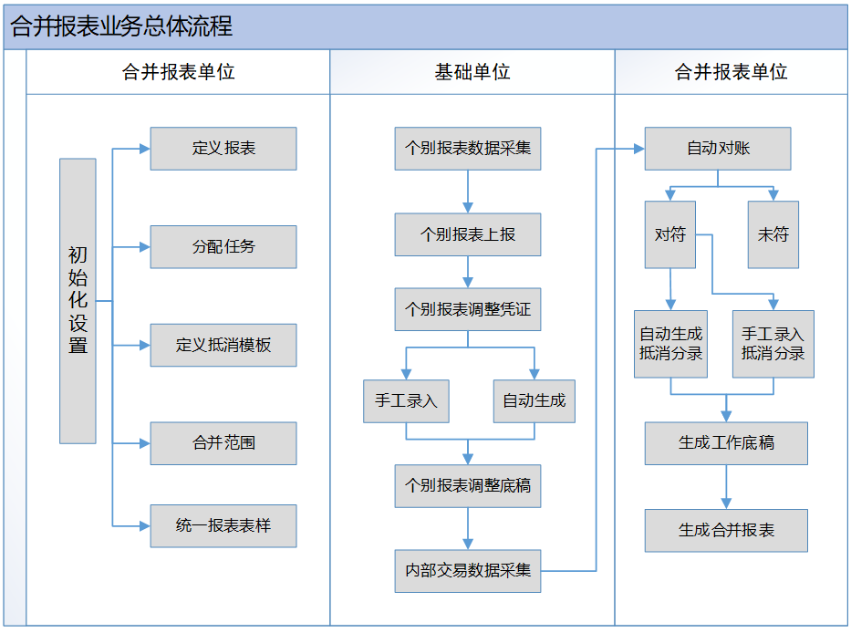 上圖描述的是一次合并的完整應用流程,是采用大合并的方式進行合并的操作步驟示意。如果整個集團采用逐級合并的方式進行合并,則每級合并主體都要經歷上述合并過程,且上級的合并要在下級的合并完成后進行。用逐級合并的方式完成一次集團合并,相當于多個合并流程的疊加。